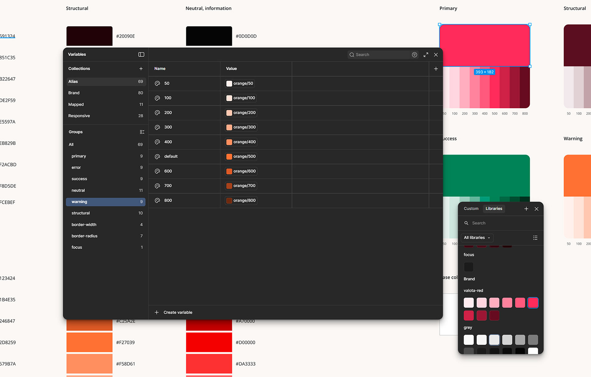 Rakentaminen alkoi perustuksista: ennen komponentteja määriteltiin yhtenäinen token-arkkitehtuuri joka toimii koko järjestelmän selkärankana. Värit ja typografia johdettiin Valotaliven nykyisestä ilmeestä, ja niiden rinnalle rakennettiin yhtenäinen välistysjärjestelmä.